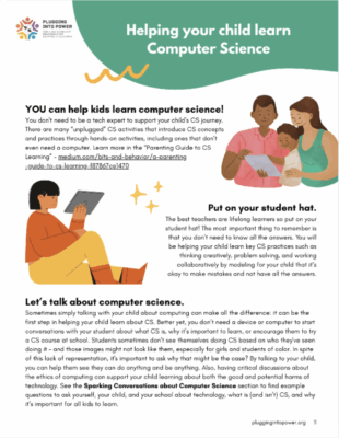 Simply talking with your child about computing can make all the difference: it might even be the first time your child ever hears about Computer Science and AI. Better yet, you don’t need a device or computer to spark conversations with kids about what computer science is, why it’s important to learn, or to encourage them to try a computing course at school. Even if they already take CS classes, talk to your child to better understand what they know. You can clarify misconceptions, discuss CS careers, and ask critical questions about the ethics of tech. Click on the Sparking Conversations handout to find sample conversation starts such as: