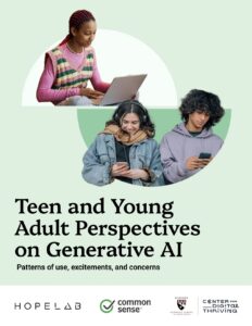 - Teen and Young Adult Perspectives on Generative AI (Common Sense Media, Hopelab, Harvard Graduate School of Education)